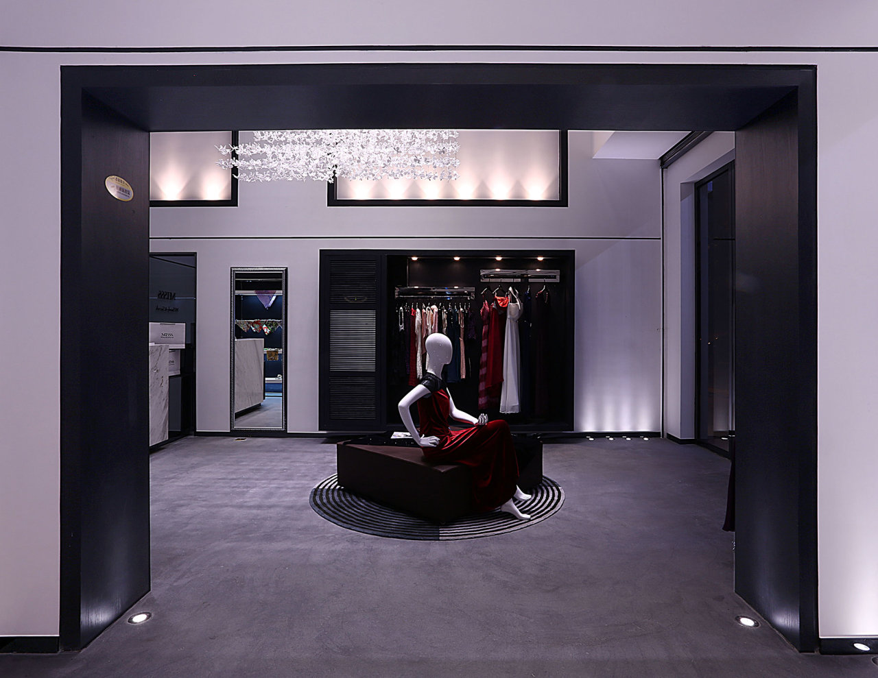工作室内的整体灯光环境都比较中性的,既有冷色调的高级感也有暖色的亲切感,让人更相信工作室的专业同时可以尽情地将自己的想法向设计师表达。为了突出定制服装的特色,灯具采用较高显指的光源,让服饰的真实颜色高度还原,让服装看起来更鲜艳亮丽。